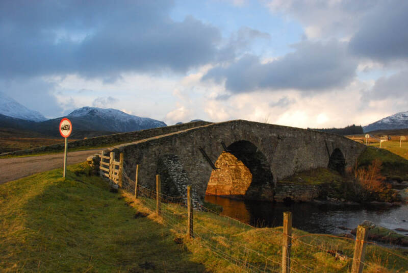 Shortly before reaching the bridge a magnificent view over the valley can be seen from a rise in the road, where the river runs down between the mountains through low-lying meadows which are often rapidly flooded when the waters come down in spate. Indeed, about Laggan Bridge, embankments have been built outside the river’s true banks to try and keep it within bounds in flood-time.